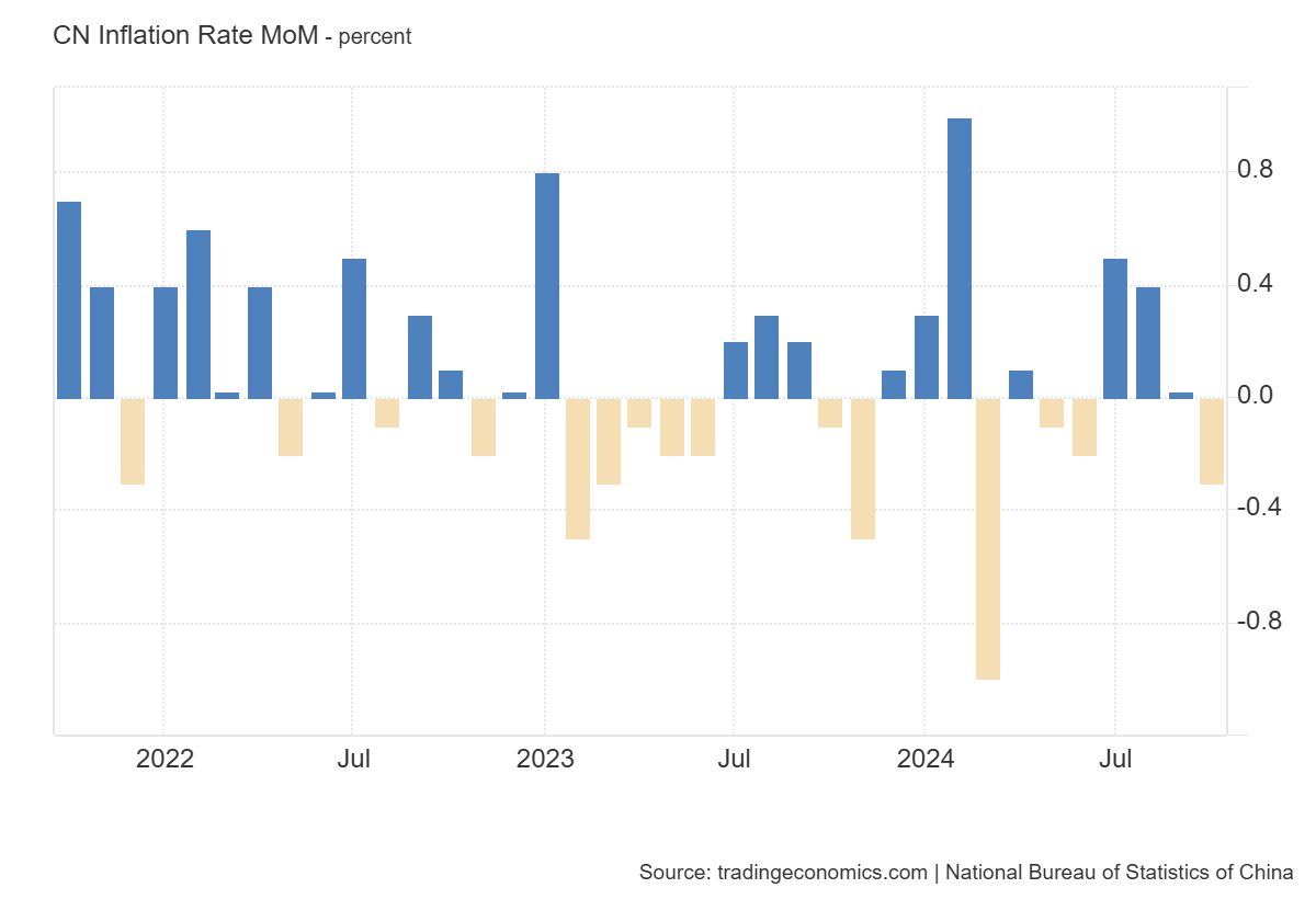 La tasa de inflación anual de China se situó en 0.3% en octubre de 2024, en comparación con las estimaciones del mercado y el 0.4% de septiembre.