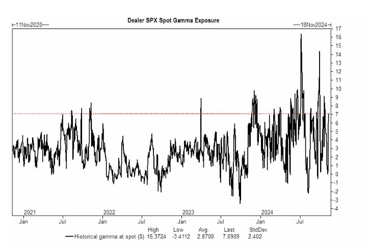 El posicionamiento de gamma de los dealers ha vuelto a subir hasta aproximadamente $7.5 mil millones en el nivel actual, pero se acortará en caso de un gran rally en comparación con una venta. Esto, junto con un calendario macro/micro más tranquilo, debería empezar a reducir la volatilidad realizada.