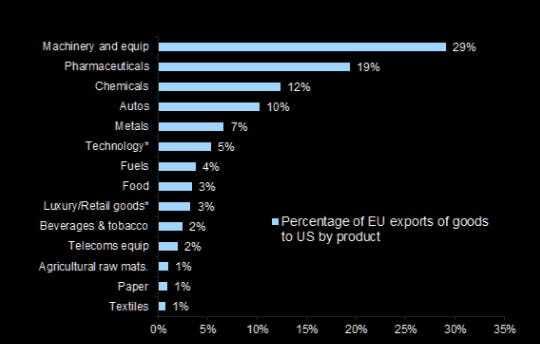 El gráfico muestra el % de bienes exportados de la UE a EE. UU. por producto (en USD).