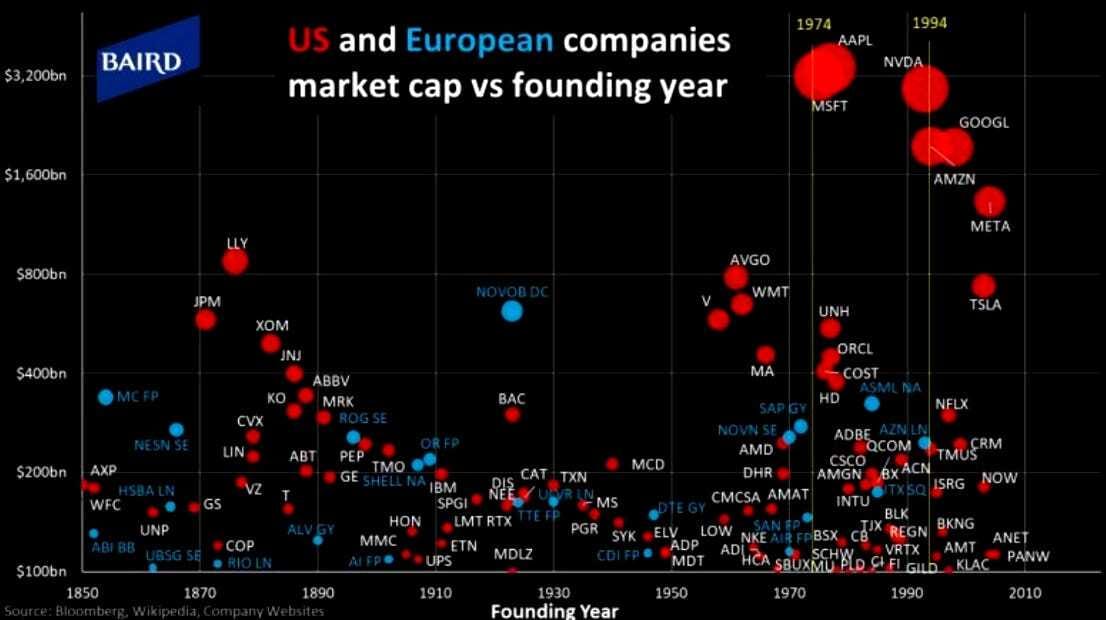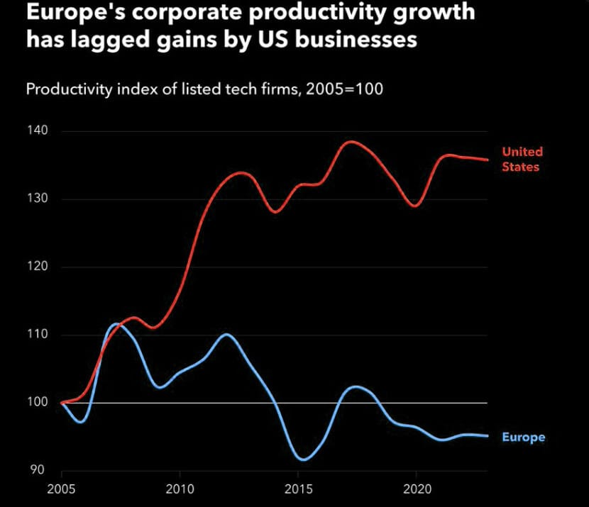 "Europa está atrapada en una estructura industrial estática en la que surgen pocas empresas nuevas que alteren las industrias existentes o desarrollen nuevos motores de crecimiento. De hecho, no hay ninguna empresa de la UE con una capitalización de mercado de más de 100.000 millones de euros que haya sido creada desde cero en los últimos cincuenta años, mientras que las seis empresas estadounidenses con una valoración superior a 1 billón de euros se han creado en este período" (Tony P)