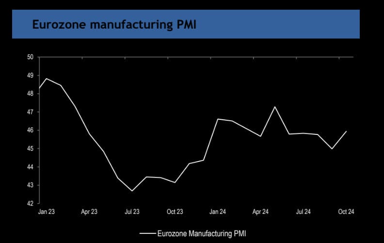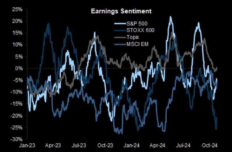 "No ha sido una semana agradable para los activos europeos. Hemos sido testigos de una reducción gradual del riesgo en Europa desde las elecciones francesas... con lo que parecía una aceleración antes de las elecciones estadounidenses... y luego un final triunfal hacia el final de la semana. En general, muy doloroso. GS Research cree que se avecinan aranceles de entre el 10 y el 20%... y es probable que el sector automovilístico y Alemania sean los más afectados. La administración Trump también probablemente presionará a los estados miembros europeos para que paguen su parte justa de la factura de la OTAN. En general, estamos pronosticando un impacto de 50 puntos básicos en el PIB de la zona del euro a raíz de la victoria de Trump, lo que dejará a Europa con un magro pronóstico de crecimiento del 0,8% para 2025. También reducirá el crecimiento de las ganancias por acción de las empresas europeas a casi cero". (Bobby Molavi)