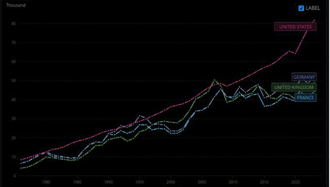 Gráfico revelador del PIB per cápita de Estados Unidos, Reino Unido, Alemania y Francia. Mientras que Estados Unidos sigue aplicando los principios del libre mercado, el espíritu emprendedor y la innovación, Europa ha optado por la sobrerregulación, la burocracia, la paranoia verde y el absurdo de la redistribución socialista.