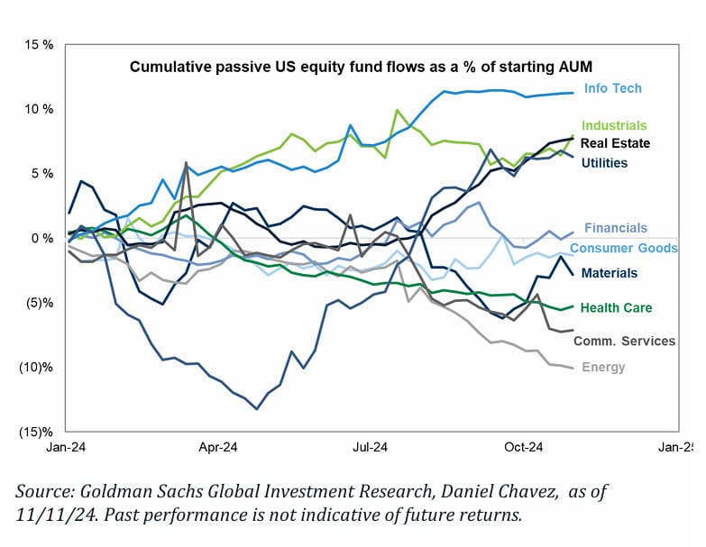 Los flujos pasivos actuales en EE. UU. de los últimos 6 meses representan el 3.2% del AUM. Sobre $12 billones en activos, esto podría implicar una demanda de $540 mil millones tras las elecciones para igualar el ritmo de 2016.