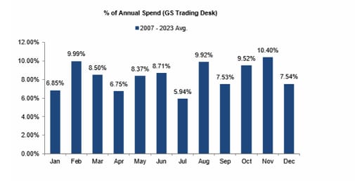 Noviembre es históricamente el mes de ejecución más grande del año que hemos visto desde nuestra mesa, con el 10.40% del gasto anual. La mesa de ejecución corporativa de GS estima $960 mil millones en recompras ejecutadas en 2024 o más de $100 mil millones en recompras de acciones en noviembre.