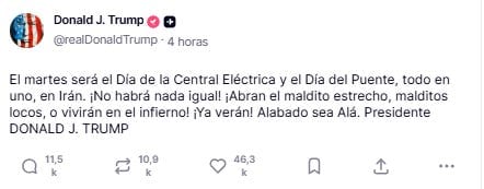 TRUMP AL WSJ: EE. UU. ATACARÁ LAS CENTRALES ELÉCTRICAS DE IRÁN SI NO ABREN EL ESTRECHO DE ORMUZ ANTES DEL MARTES POR LA NOCHE.
