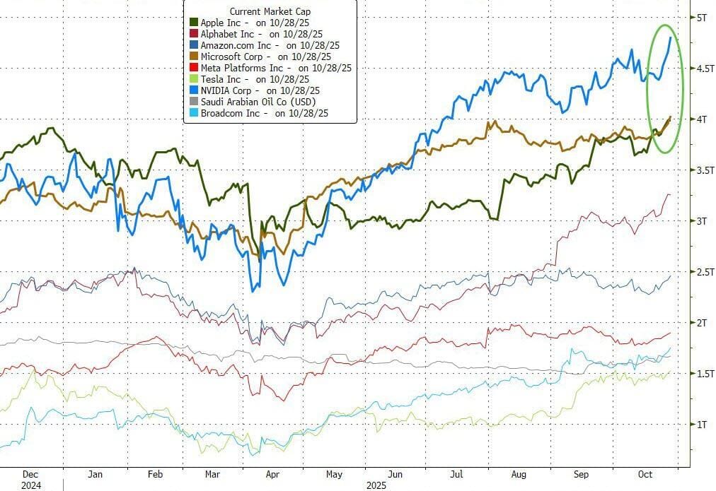 MSFT junto a AAPL alcanzaron una valoración de 4 billones de dólares hoy. NVDA supera los 4.8 billones de dólares.