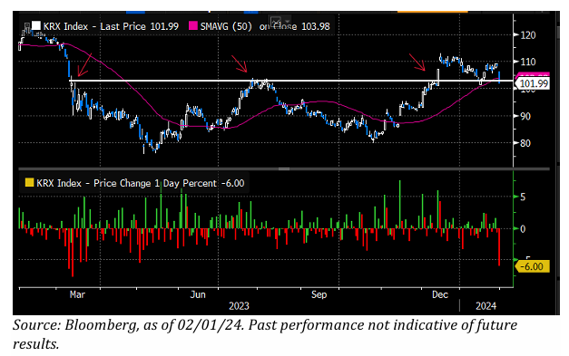 3- Ayer el ETF de banca regional $KRX registró su peor día desde marzo de 2023. Rompió su media móvil de 50 días por primera vez desde noviembre de 2023.
