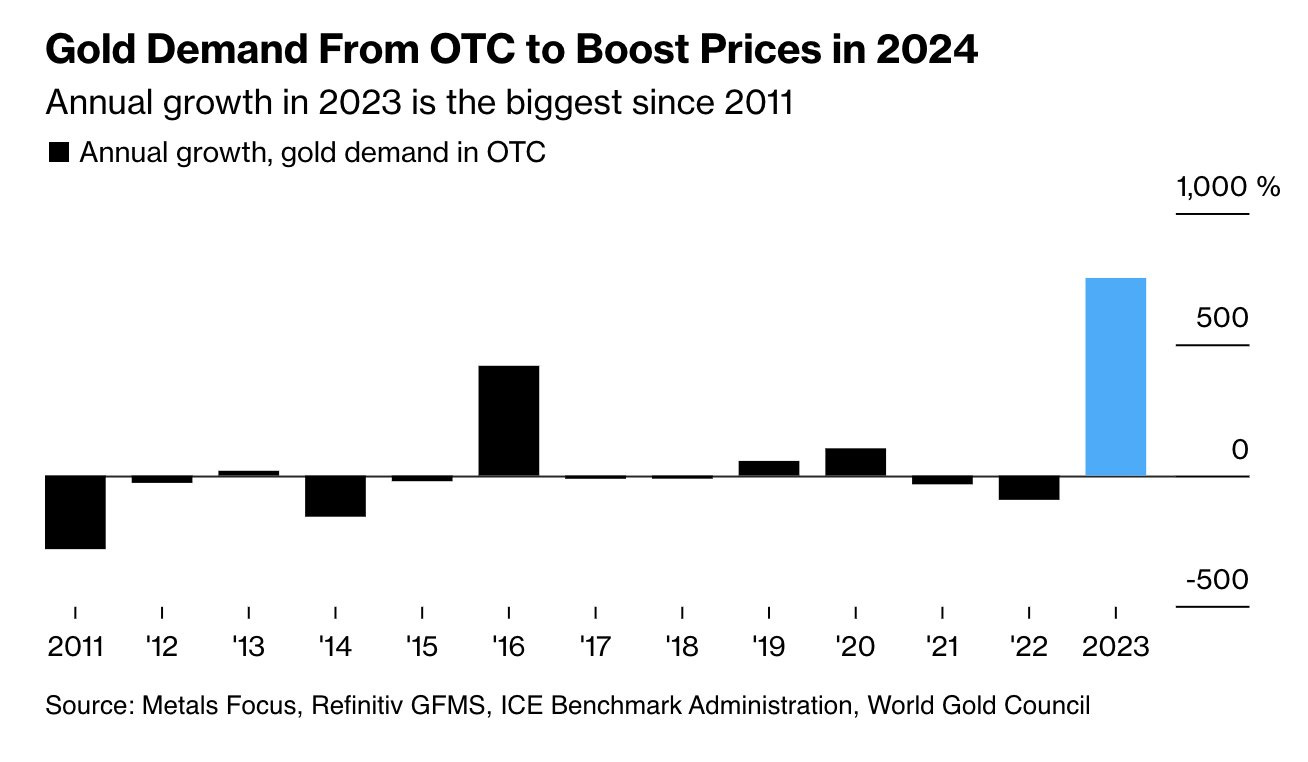 1- Según Bloomberg, la demanda de oro OTC alcanzó el año pasado el nivel más alto jamás registrado.