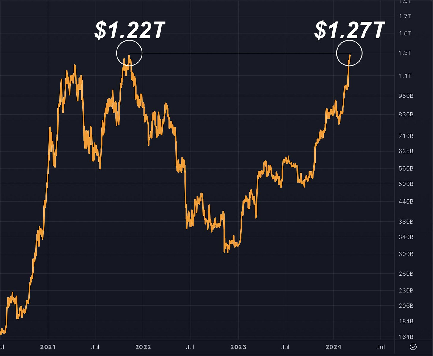 La capitalización de mercado está en ATH a pesar de que el precio es inferior al máximo histórico porque se han emitido más Bitcoin desde el último precio ATH.