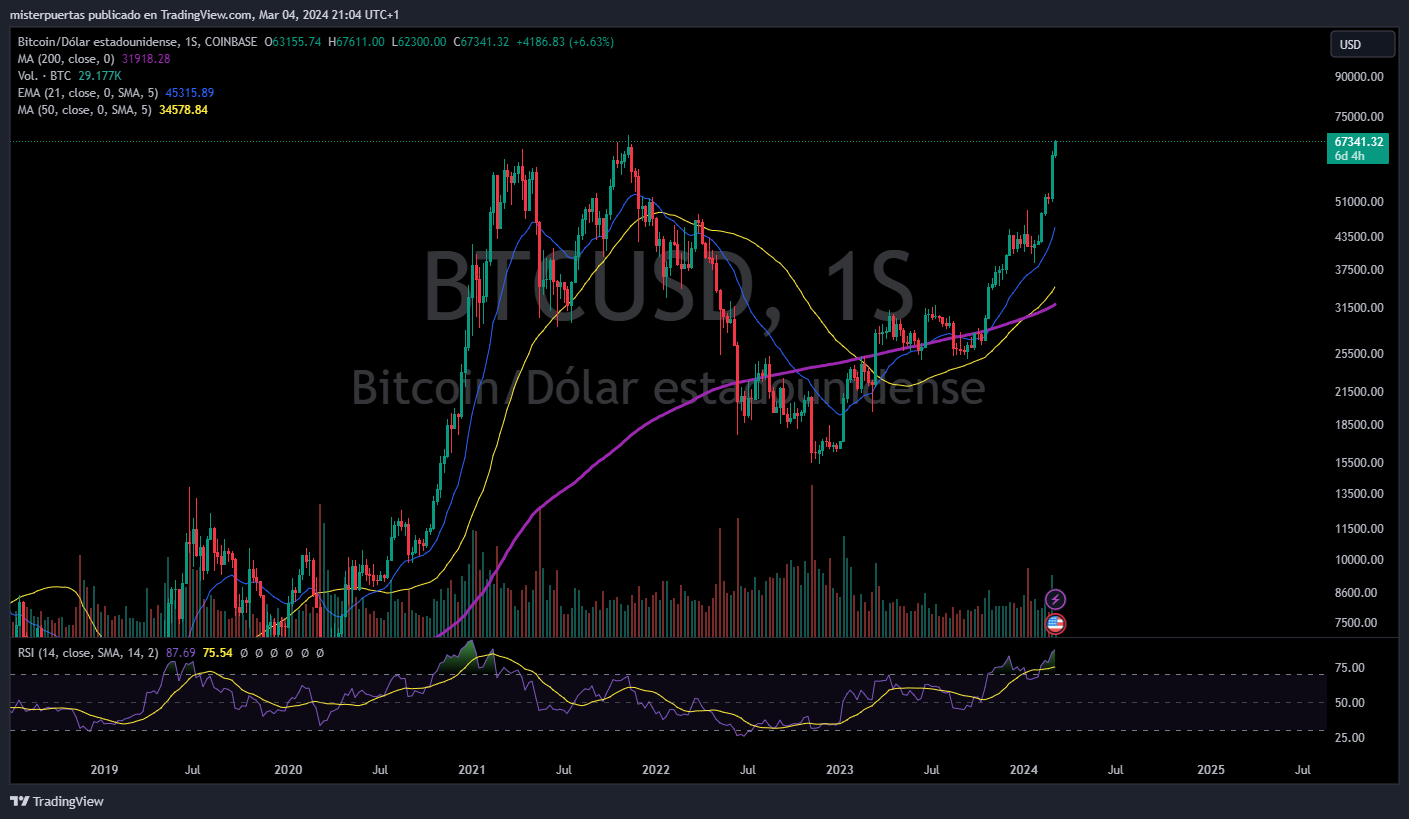 Fue otro grandioso día para BTC, quedándose muy cerca de ATH en dólares, superqando los 68000 y superándo su antiguo ATH en euros.