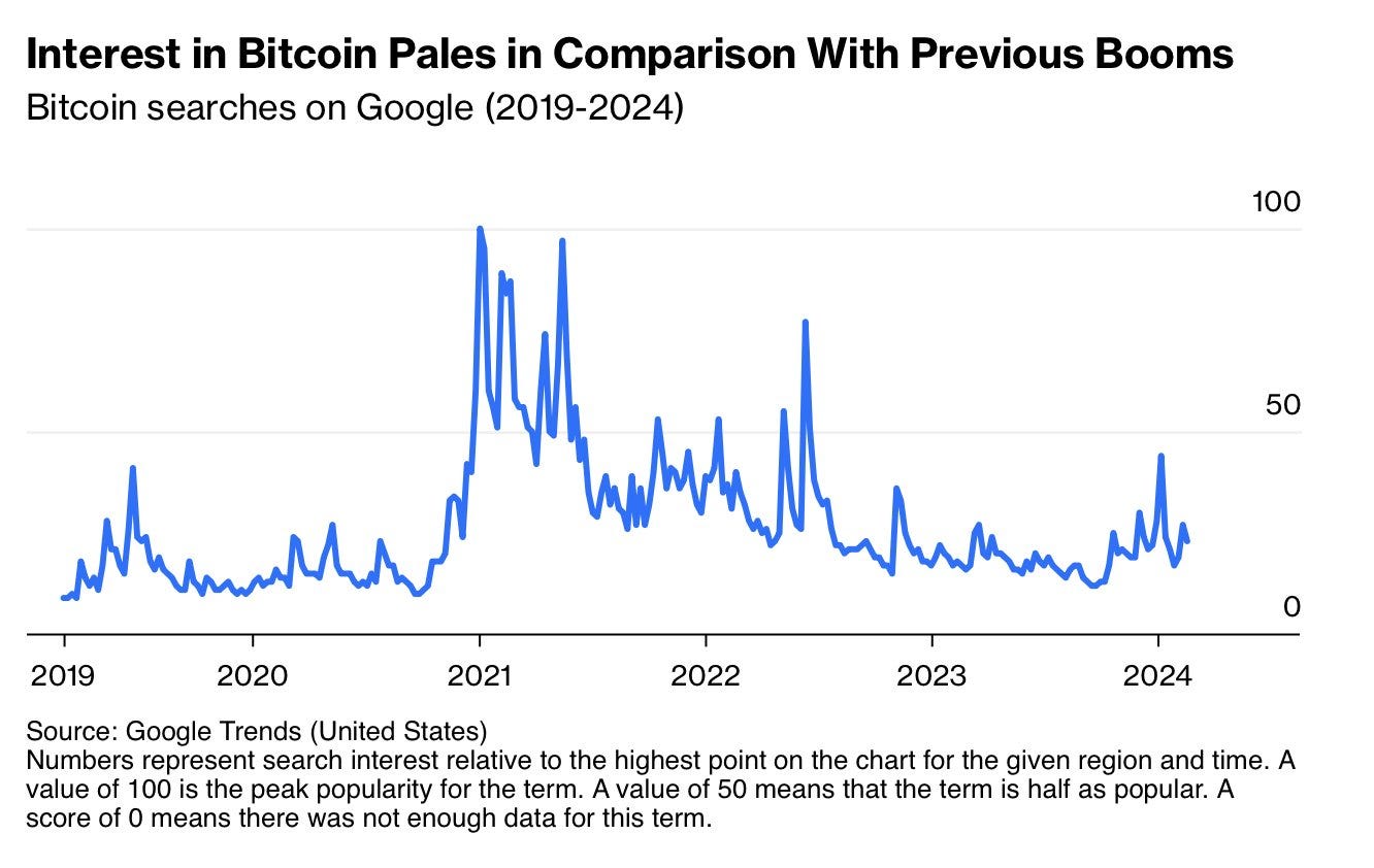 Y todo ello, después de que BBG informara que el interés minorista en Bitcoin sigue siendo significativamente más bajo que durante 2021: