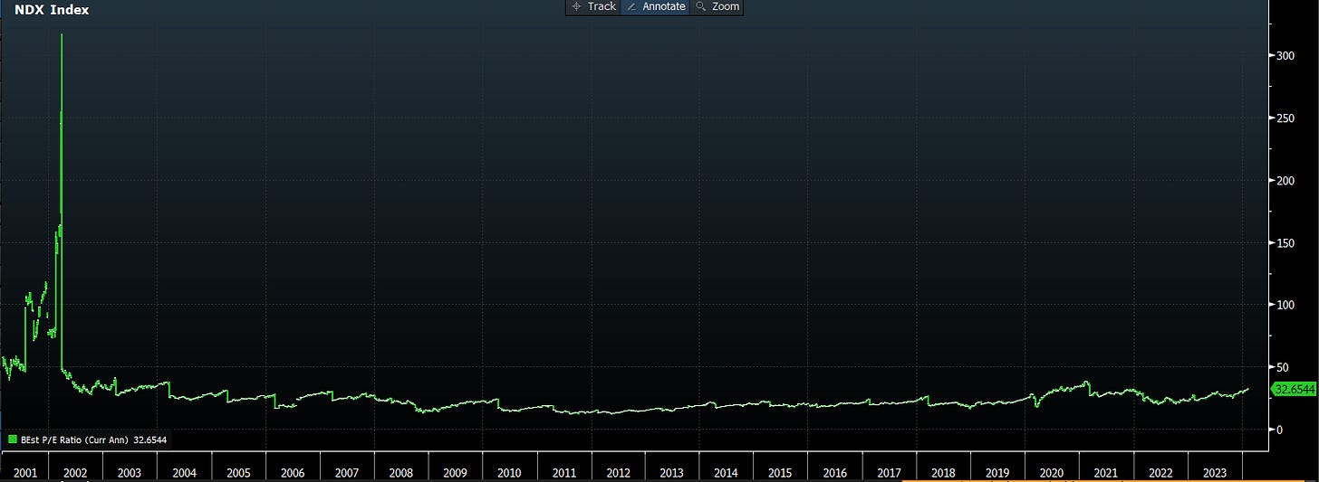 Fijese por ejemplo el PER del NDX ahora, comparado con la burbuja punto com: