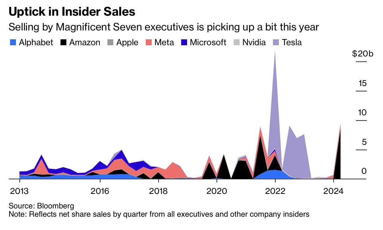 1- Los 7 magníficos ejecutivos de empresas se deshacen de sus acciones al ritmo más rápido desde 2021. (Según analisis, la venta de insiders no está correlacionado con el precio, pero no deja de ser curiosas las ventas masivas)
