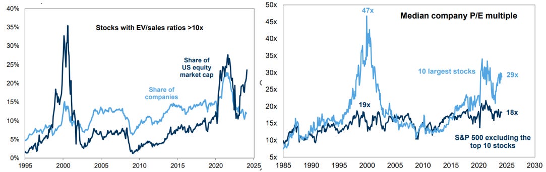 1) Las acciones con ratios EV/ventas superiores a 10x ahora representan el 24% de la capitalización del mercado de valores de EE. UU., frente al 28% durante 2021 frente al 35% durante la burbuja tecnológica de finales de los 90 (LHS).