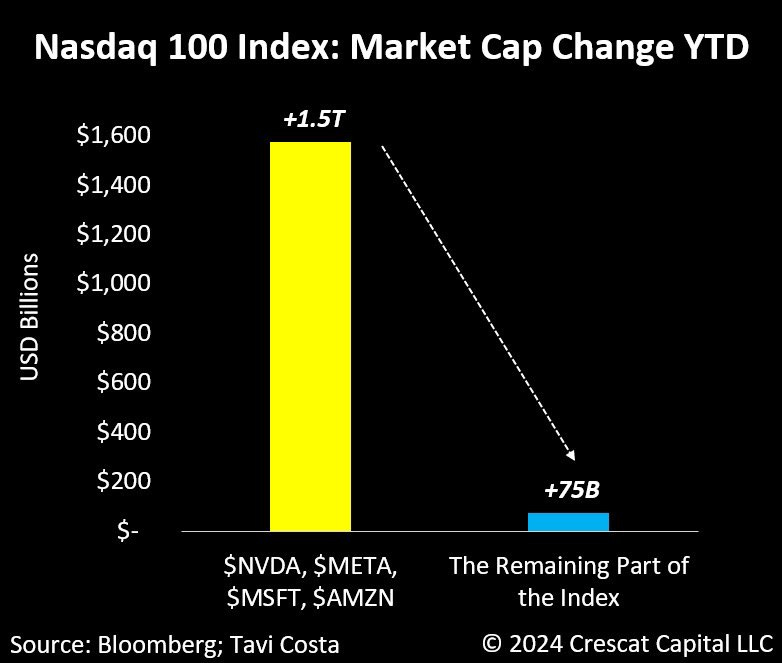 7- NVDA META MSFT AMZN representaron más del 90% de las ganancias de capitalización bursátil en el Nasdaq 100 este año.