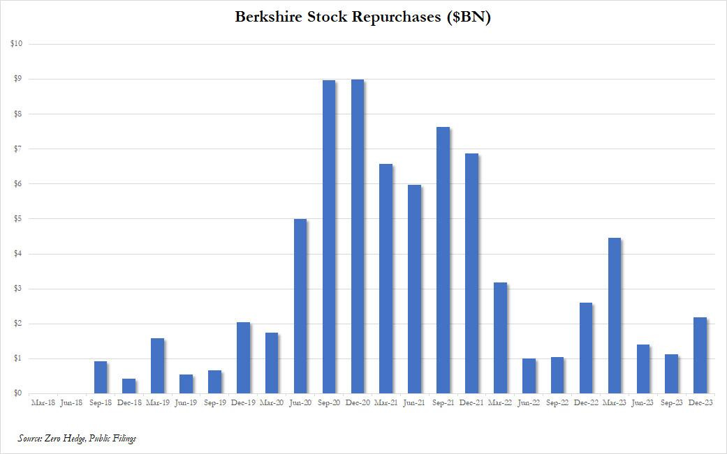BERKSHIRE HATHAWAY recompró 2.200 millones de dólares de sus propias acciones en el cuarto trimestre y aumentó las recompras de todo el año a 9.200 millones de dólares.