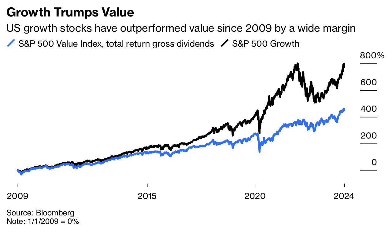3- Desde la crisis financiera mundial, las acciones de crecimiento casi han duplicado el rendimiento de las acciones de valor. - Bloomberg
