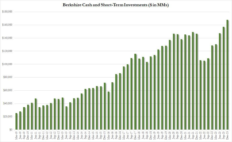 Con recompras muy por debajo de los niveles alcanzados durante 2020-2021, el efectivo de Berkshire, que sigue aumentando: