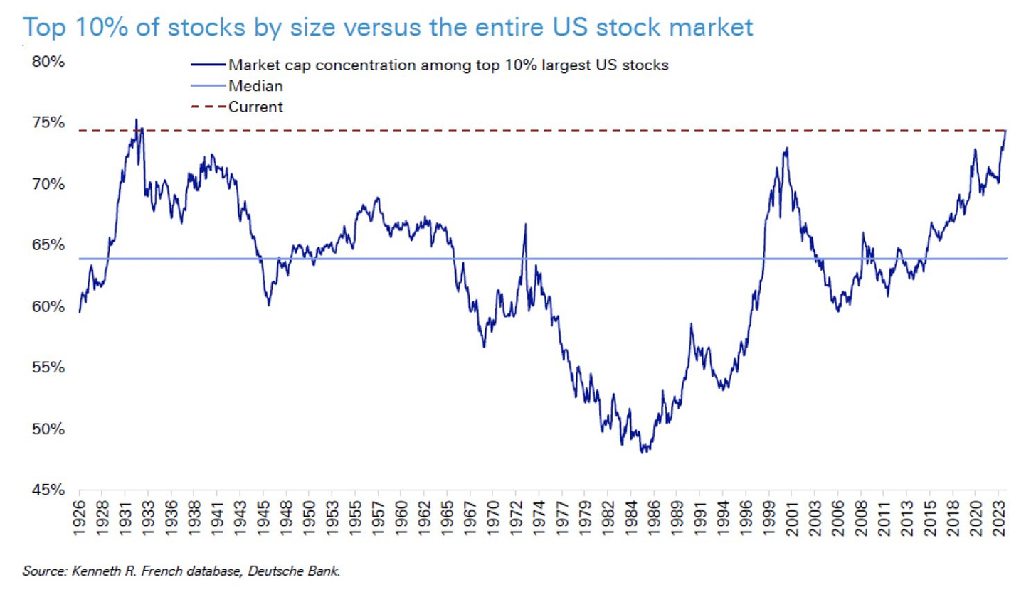 2- El 10% de los valores más importantes del S&P 500 representan el 75% del SPX, el mayor nivel de concentración desde la Gran Depresión.