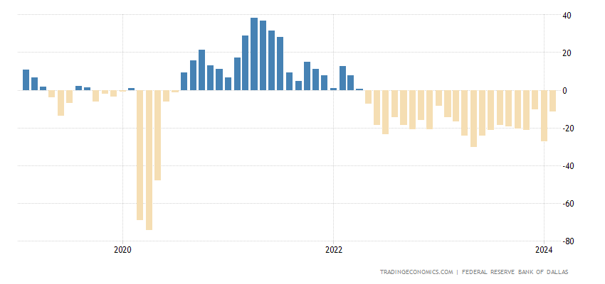 El índice de actividad empresarial general del Banco de la Reserva Federal de Dallas para la manufactura en Texas aumentó a -11.3 en febrero de 2024 desde un mínimo de ocho meses de -27.4 en el mes anterior.