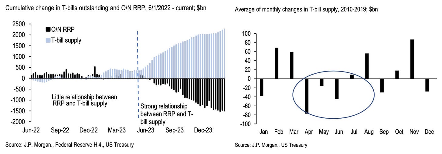 El suministro inusualmente pesado de letras del Tesoro, desde mediados de 2023, proporcionó una alternativa atractiva al RRP permitiendo que las Reservas mantuvieran un saldo frente al RRP. JPM espera que esto vaya a cambiar a corto plazo y que estemos al borde de entrar en un período en el que históricamente el suministro neto de letras del Tesoro está a punto de volverse negativo.