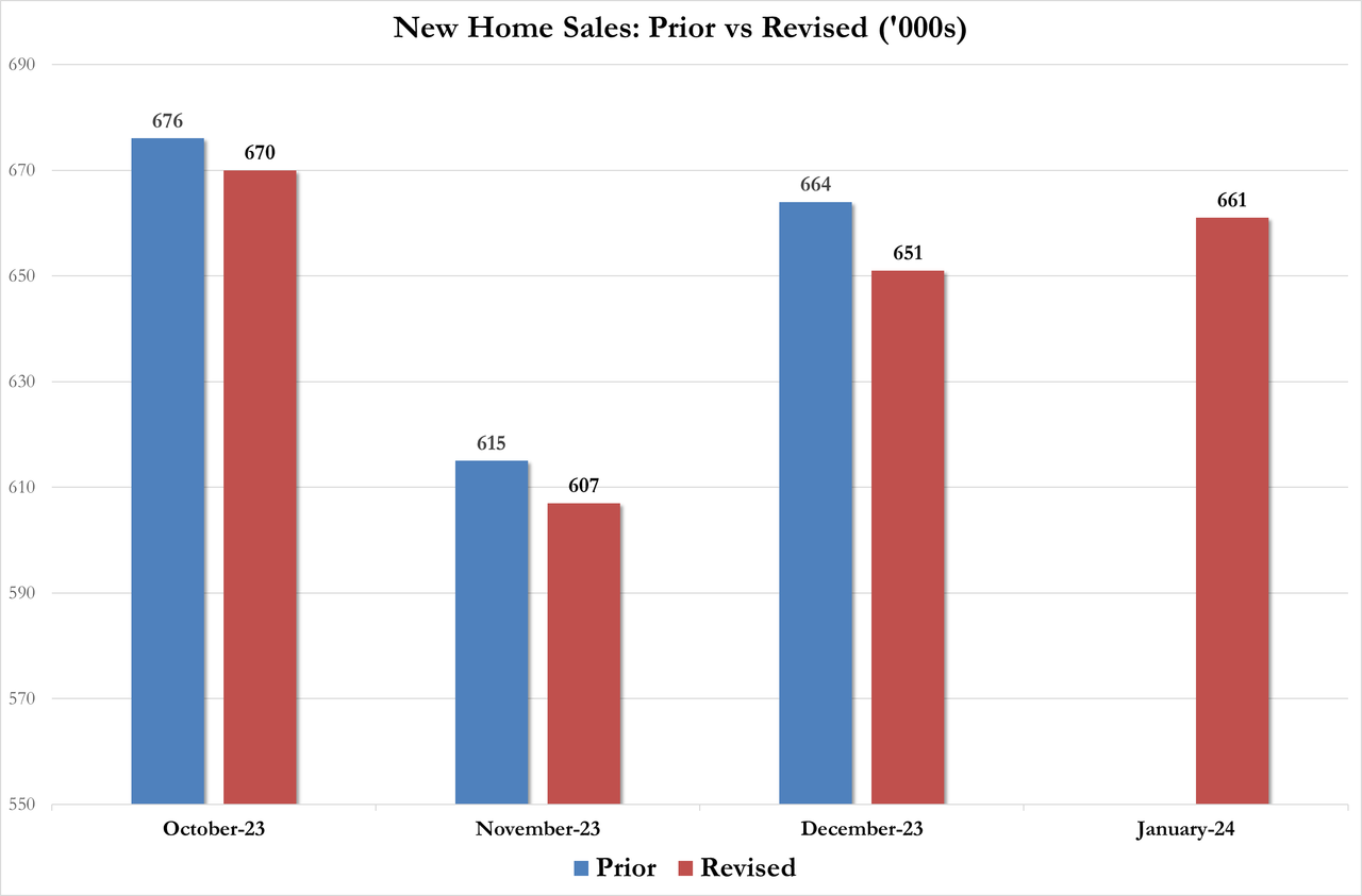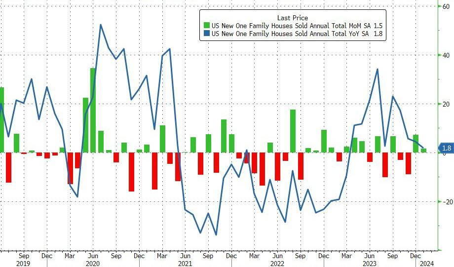 Las ventas de viviendas unifamiliares nuevas en Estados Unidos aumentaron un 1,5% respecto al mes anterior, hasta una tasa anualizada desestacionalizada de 661.000 en enero de 2024, por debajo de las expectativas del mercado de 680.000.