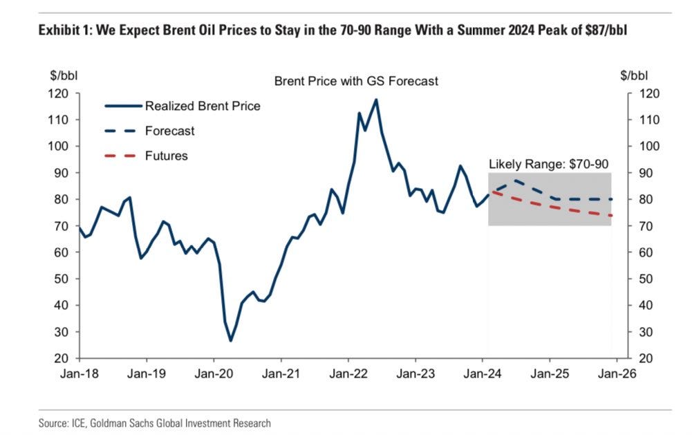 6- GOLDMAN: "... ¿Cómo podría el petróleo salir del rango de 70-90? ... Una caída sostenida por debajo de 70 $ requeriría probablemente una demanda mucho más débil y un cambio en la estrategia saudí. Tomamos beneficios en la opción corta de venta de 70 $ y larga de compra de 80/90 $ en el Brent Jun24, y ampliamos la operación hasta el 24 de diciembre."
