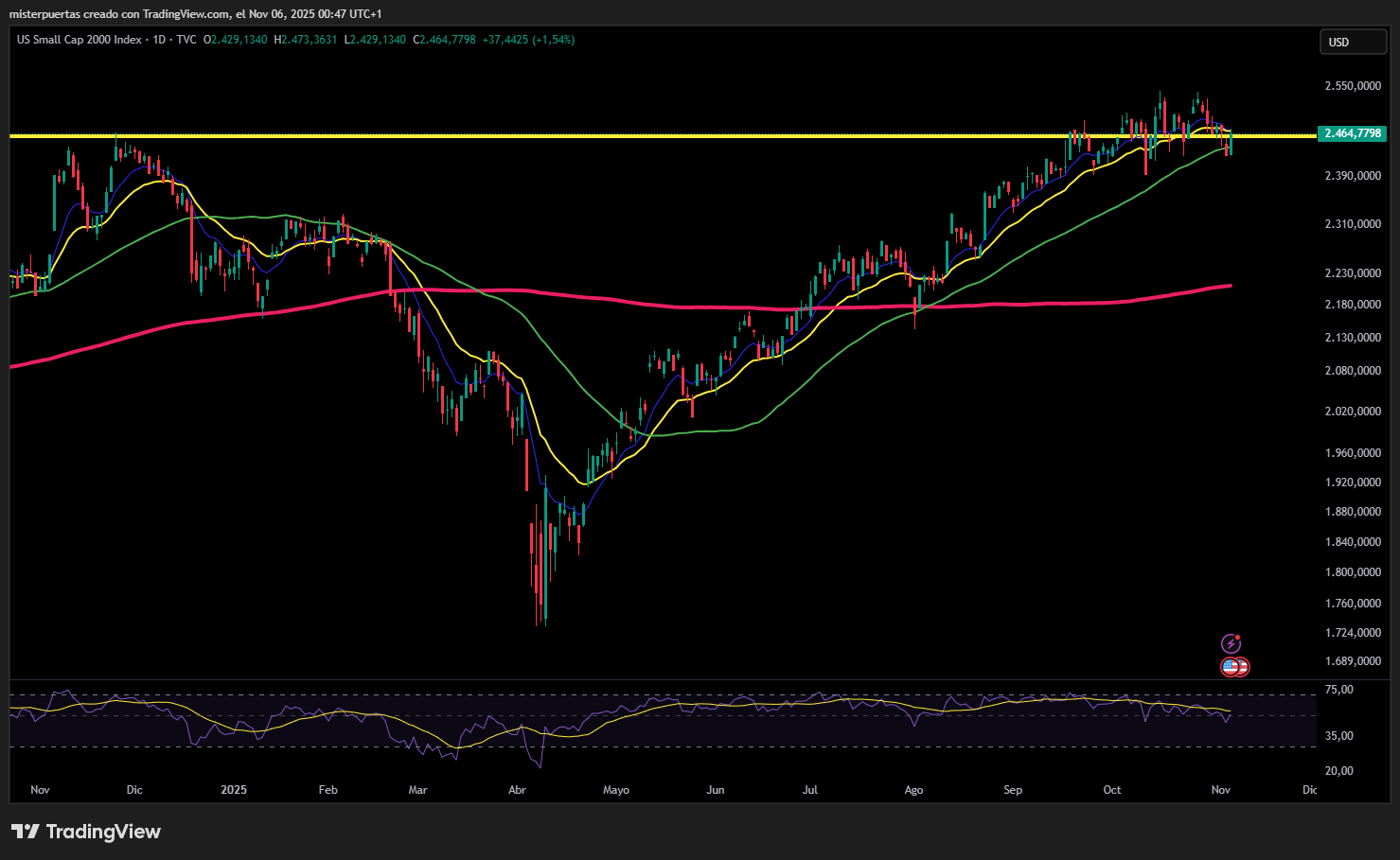 Wall Street🟢 S&P500 +0.37% 🟢 Dow Jones +0.48% 🟢 Nasdaq100 +0.72% 🟢 Russell2000 +1.54% Otros activos🔴 WTI -1.28% 🟢 XAU/USD +1.22% 🟢 BTC/USD +1.92% | Europa🟢 German DAX +0.42% 🟢 Stoxx 600 +0.23% 🟢 France's CAC +0.08% 🟢 Spain's Ibex +0.39% Asia🔴 Nikkei 225 -2.50% 🔴 Hang Seng -0.07% 🔴 Nifty 50 -0.64% |