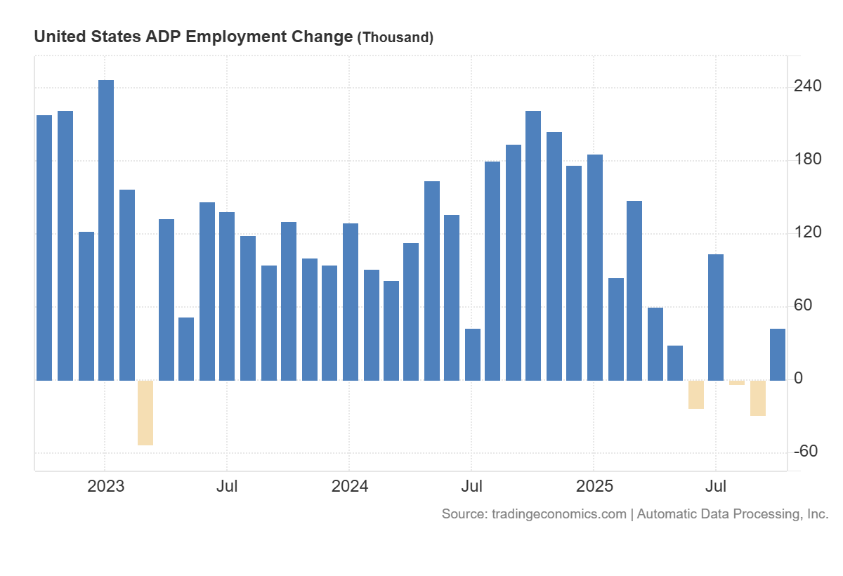 En octubre de 2025, las empresas privadas en EE. UU. crearon 42.000 empleos, rebotando tras la revisión al alza de una pérdida de 29.000 empleos en septiembre y superando las previsiones de 25.000.