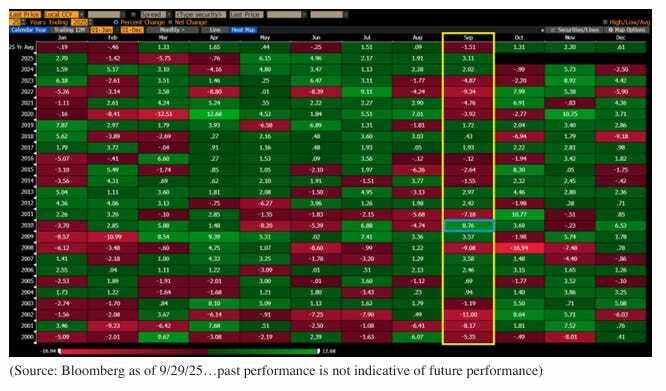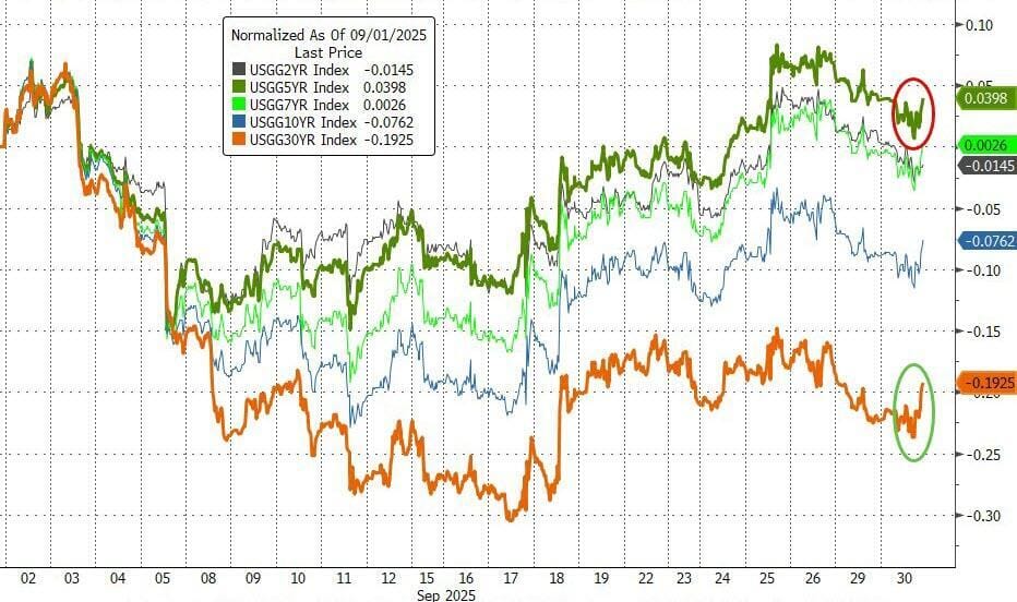 Los bonos del Tesoro tuvieron un comportamiento dispar en septiembre, con rendimientos que cayeron antes de la reunión del FOMC y subieron después. El extremo largo tuvo un rendimiento superior, mientras que los rendimientos a 5 años fueron el único segmento de la curva que cerró el mes al alza.