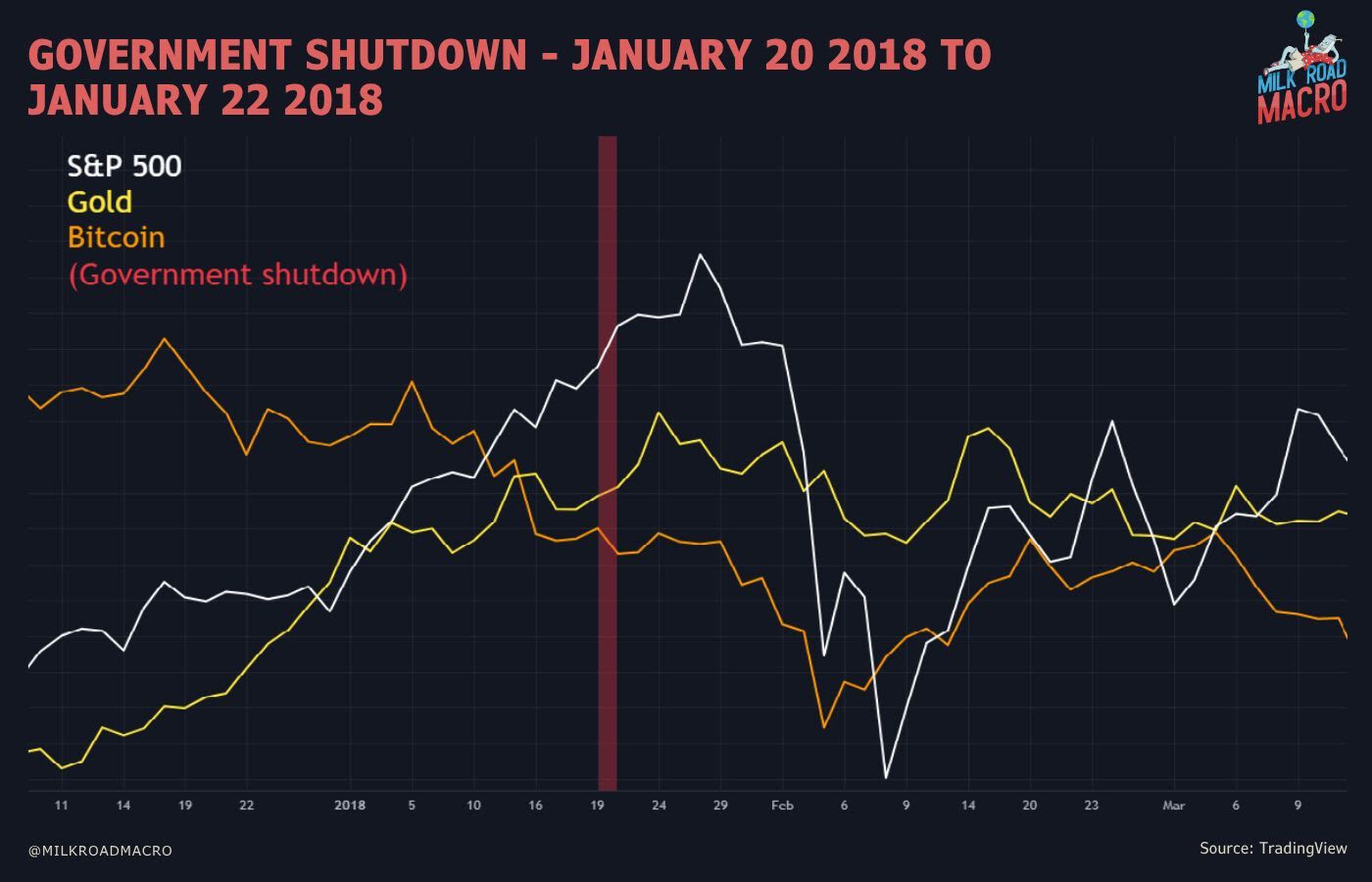 Durante el cierre de enero de 2018, el S&P 500 subió marginalmente (+0,8%), el bitcoin cayó (-12,4%, justo en medio de un mercado bajista feroz) y el oro subió ligeramente (+0,4%).