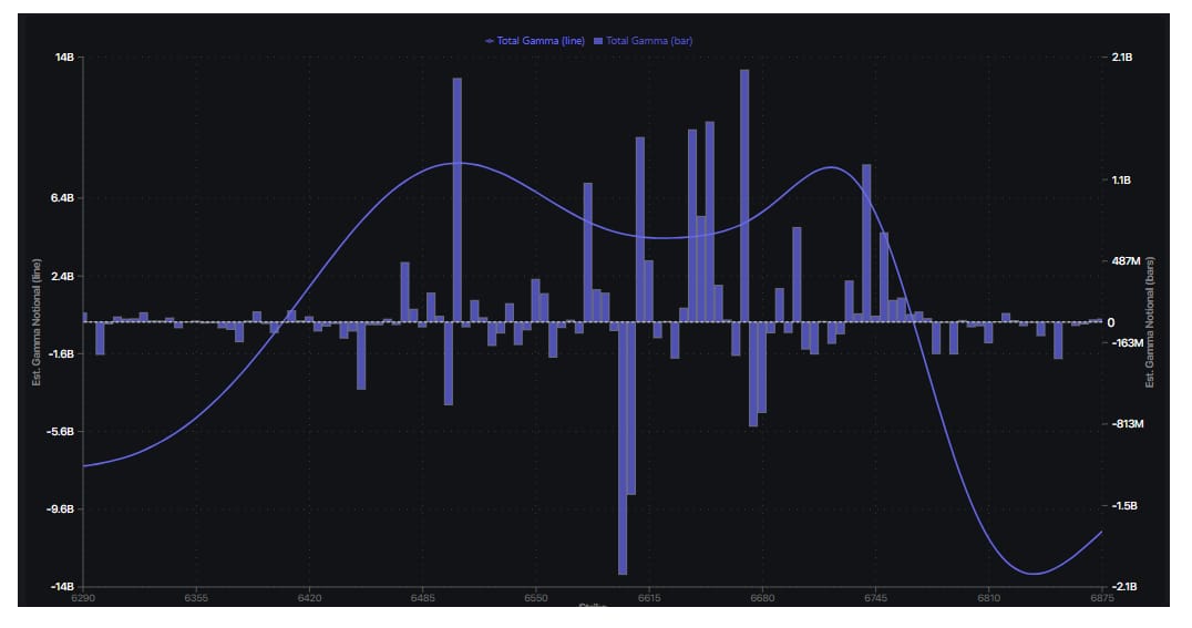 Y el posicionamiento gamma en el SPX muestra que una fuerte concentración gamma positiva entre 6.500 y 6.700 ha estabilizado el precio, ya que los market makers se cubren vendiendo en las subidas y comprando en las bajadas.