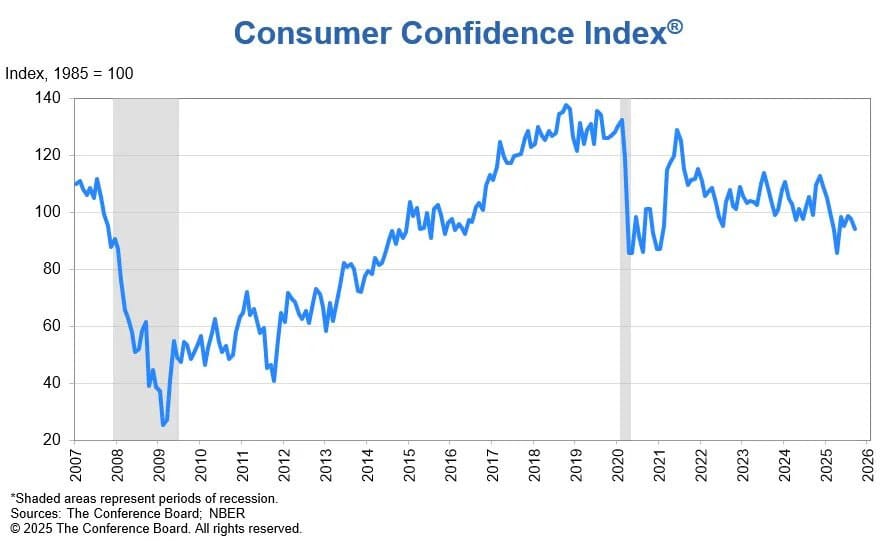 1- El índice de confianza del consumidor del Conference Board volvió a caer en septiembre, bajando 3,6 puntos hasta 94,2, tras una revisión al alza de +0,4 puntos en agosto. Es el nivel más bajo en cinco meses. Los componentes también se deterioraron. La mayor caída vino del índice de situación actual, que retrocedió 7 puntos hasta 125,4, tras una revisión al alza de +1,2 puntos en agosto. Es su nivel más bajo en un año.