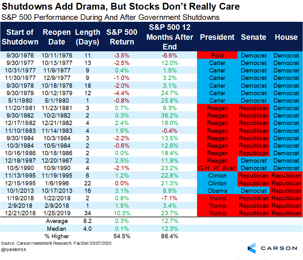 Históricamente, los cierres no son un obstáculo de medio plazo: el S&P 500 ha promediado +13% a 12 meses vista tras episodios similares. Vía Ryan Detrick