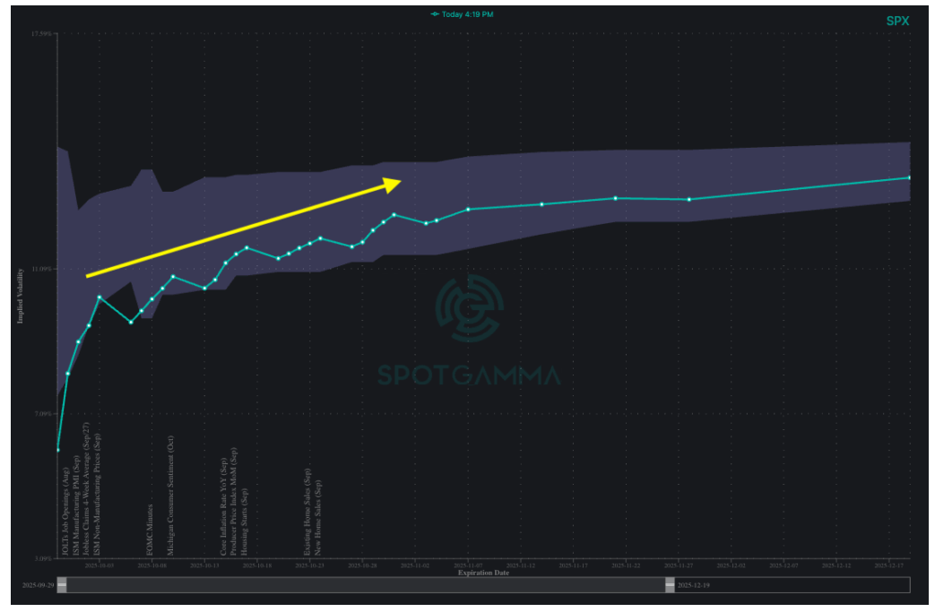 La volatilidad implícita del SPX aumenta notablemente inmediatamente después del 30/9, cuando vence el JPM Collar y una posición gamma positiva similar.