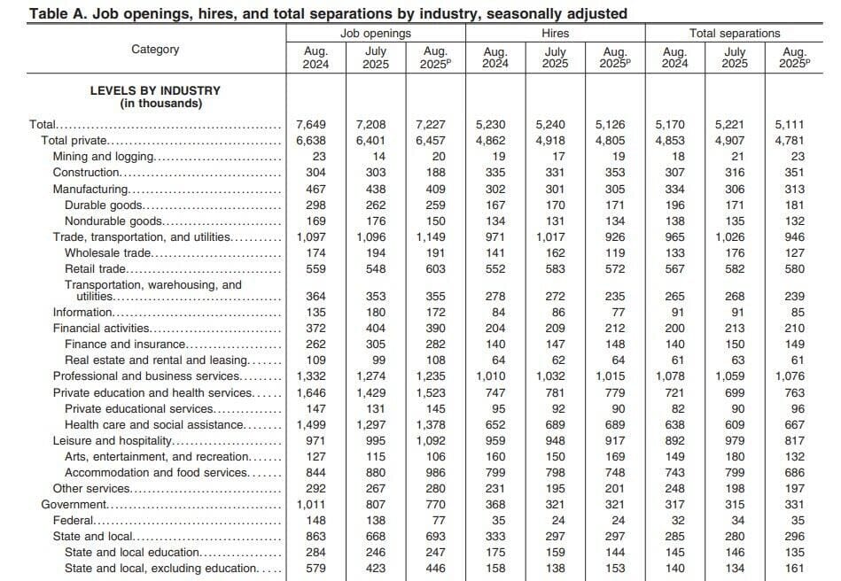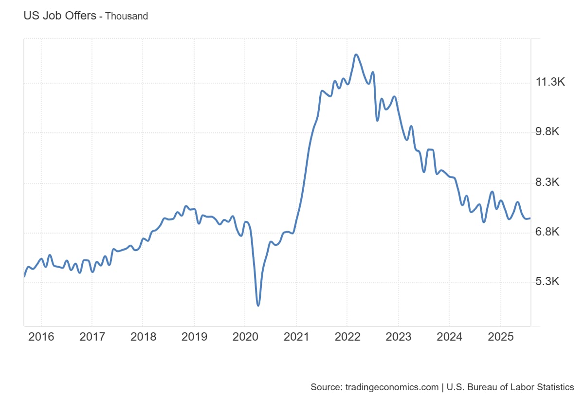 Las ofertas de empleo en Estados Unidos aumentaron en 19.000 hasta un total de 7,227 millones en agosto de 2025, partiendo de una cifra revisada al alza de 7,208 millones en julio y en línea con las expectativas del mercado.