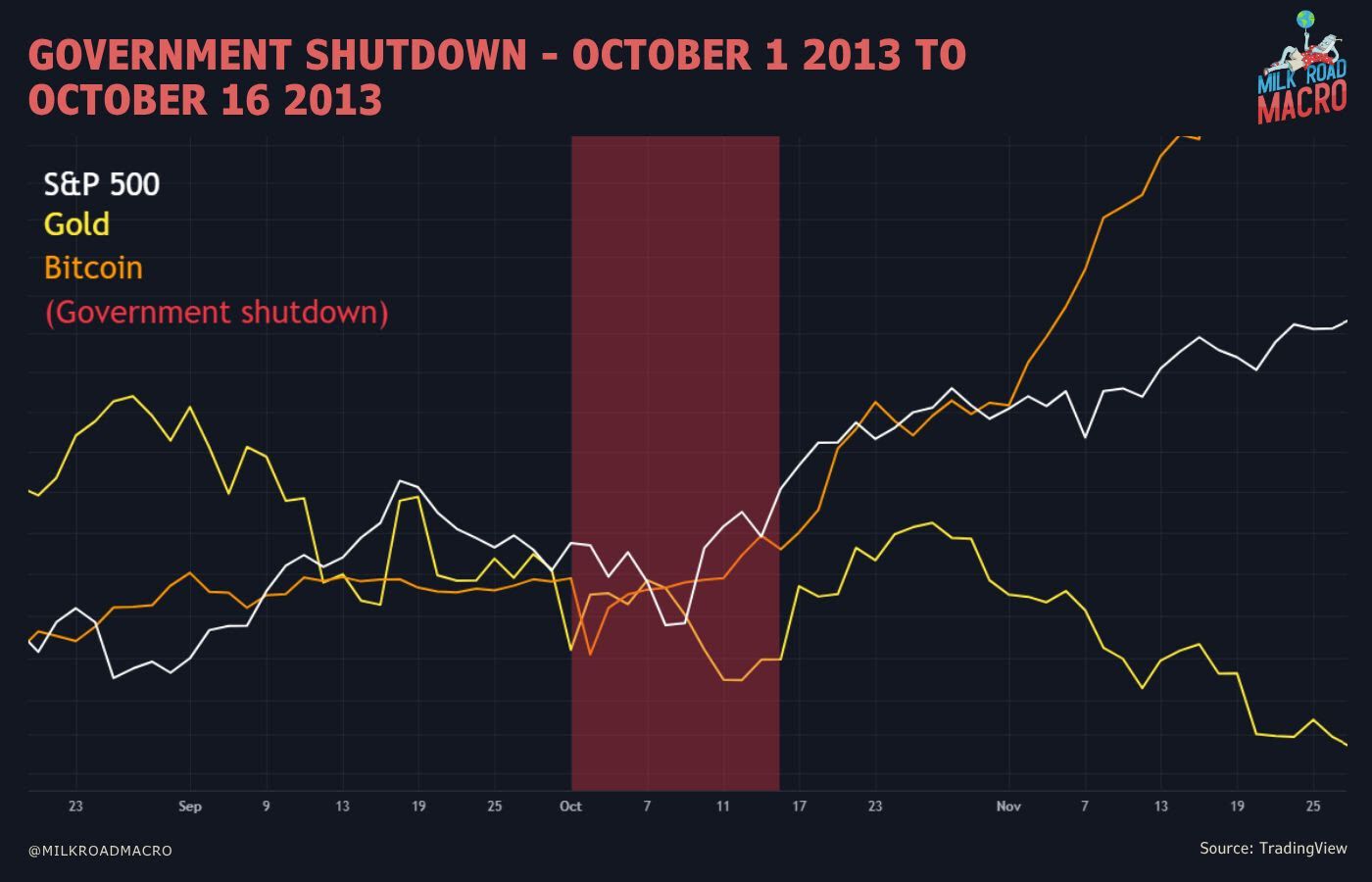 Durante el cierre de octubre de 2013, el S&P 500 subió (+1,57%), el bitcoin subió fuertemente (+12,4%) y el oro cayó un poco (-0,5%).