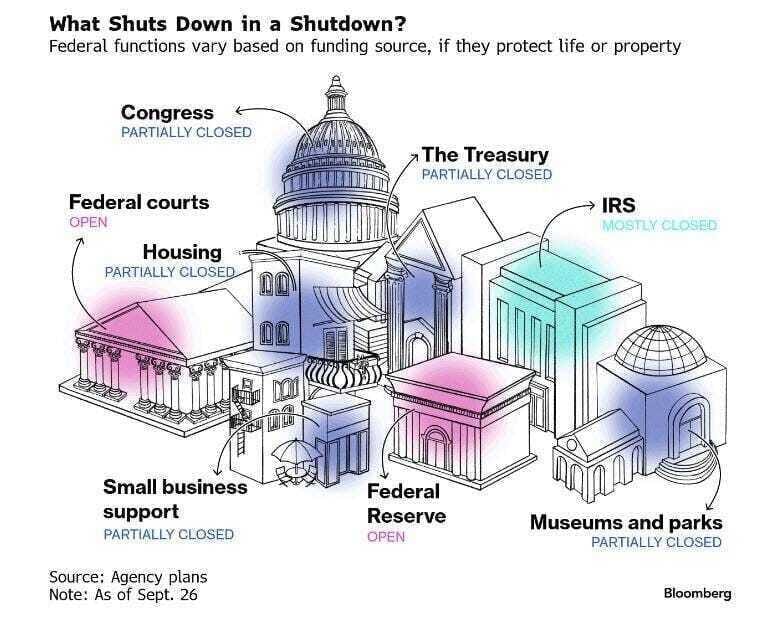 BLS quedaría cerrado → NFP y CPI no se publicarían. Ya se ha advertido que los datos económicos dejarán de publicarse si ocurre un CIERRE de GOBIERNO.