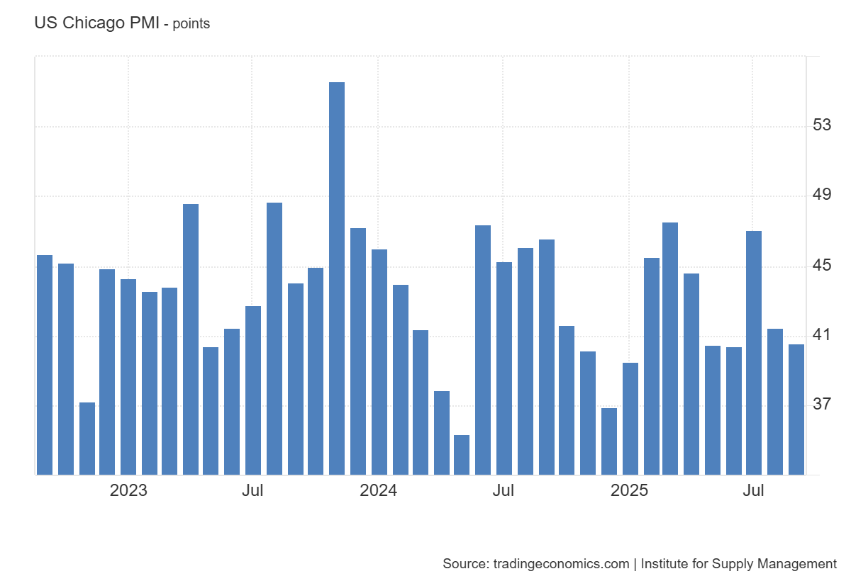 2- Se trata de un dato secundario... Pero sigue mostrando debilidad: El Barómetro Empresarial de Chicago cayó a 40,6 en septiembre de 2025 desde 41,5 el mes anterior, muy por debajo de las expectativas del mercado, que apuntaban a una mejora hasta 43. Esto refleja la contracción más intensa de la actividad en tres meses. Es además la lectura número 22 consecutiva por debajo del umbral neutral de 50, prolongando la tendencia contractiva observada en la encuesta.
