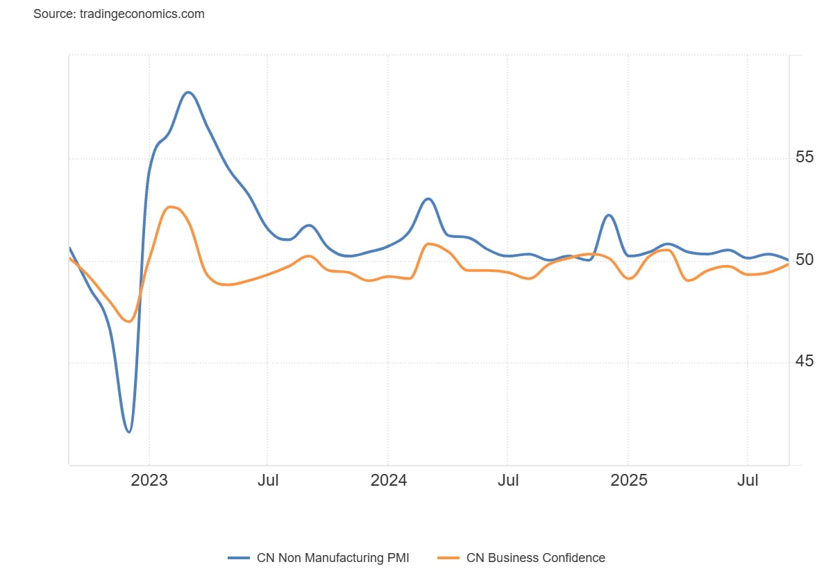 El PMI oficial no manufacturero de China (NBS) cayó a 50,0 en septiembre de 2025, por debajo tanto de la lectura de agosto como de las previsiones del mercado de 50,3.