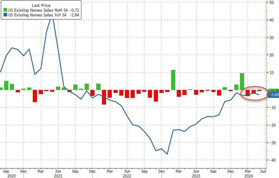 Las ventas de viviendas existentes en EE.UU. descendieron un 0,7%, hasta una tasa anualizada desestacionalizada de 4,11 millones de unidades en mayo de 2024, la más baja en cuatro meses, frente a los 4,14 millones de abril y las previsiones de 4,1 millones.