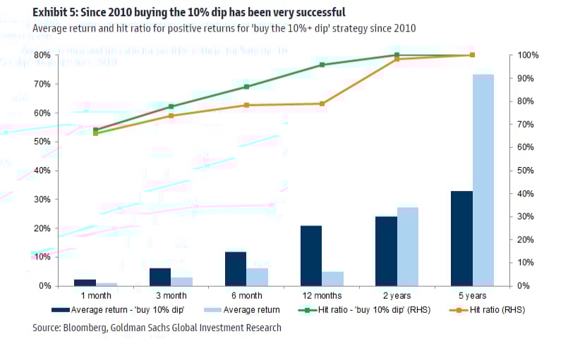 3- Desde la Crisis Financiera Global, la estrategia de 'comprar en las caídas' del S&P 500 ha sido exitosa en respuesta a cualquier caída del 10% o más. Los rendimientos subsiguientes promedio de simplemente comprar el S&P 500 después de una caída del 10%+ fueron superiores al promedio desde 2010 - las tasas de éxito también fueron más altas.