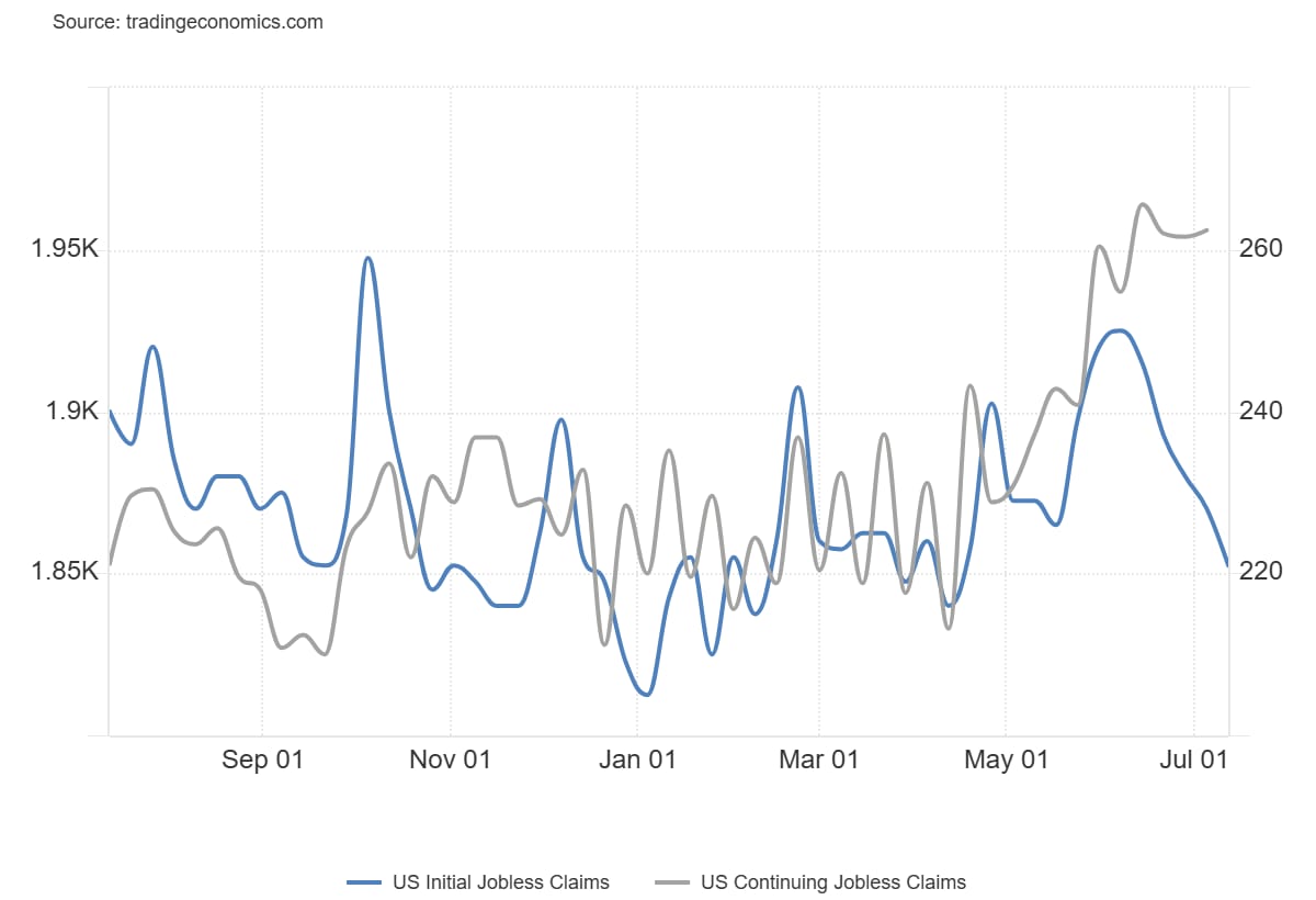 Las solicitudes continuas se mantuvieron prácticamente sin cambios, en 1.956.000, también por debajo de las previsiones del mercado, y se mantienen por debajo de los máximos de 2021 registrados en junio.