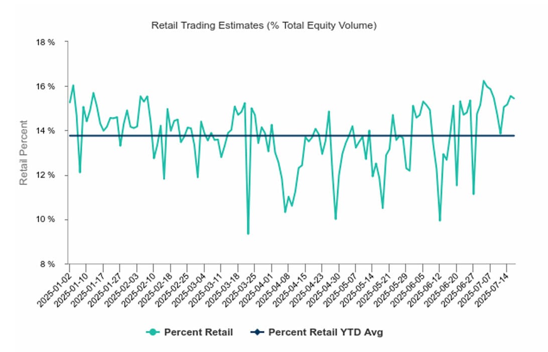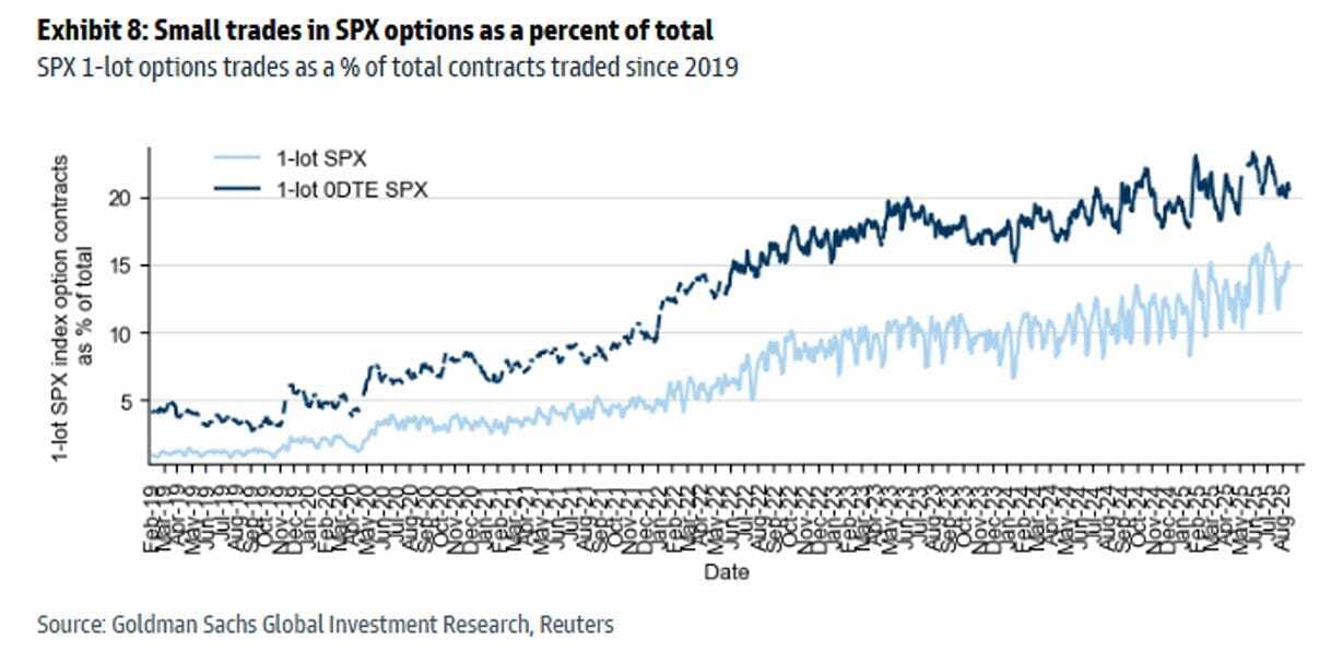 La actividad minorista ha seguido siendo alta y se refleja claramente en los pequeños contratos ODTE (opciones con vencimiento en el mismo día). El hecho de que las criptomonedas estén en máximos históricos sin duda mantiene vivos los instintos especulativos.