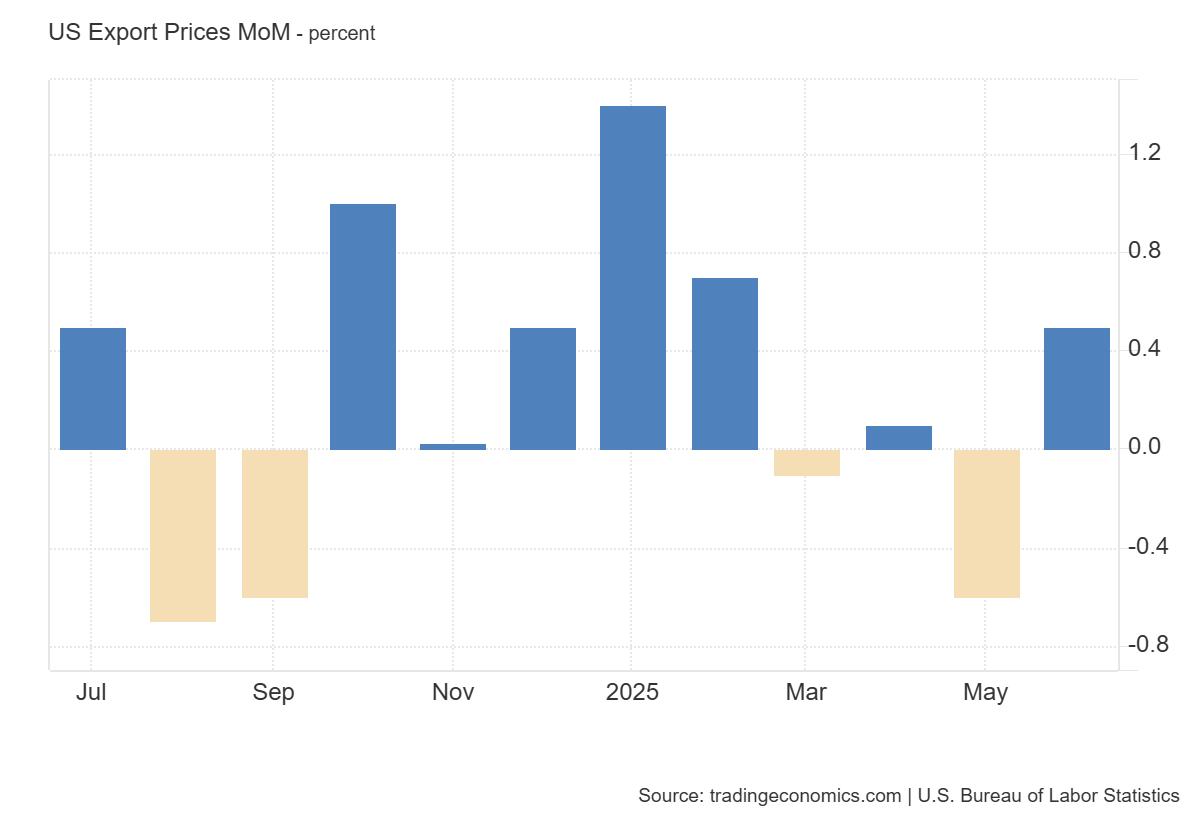 Los precios de exportación en Estados Unidos aumentaron un 0,5 % mensual en junio de 2025, tras una caída del 0,6 % en mayo y superando las expectativas del mercado.