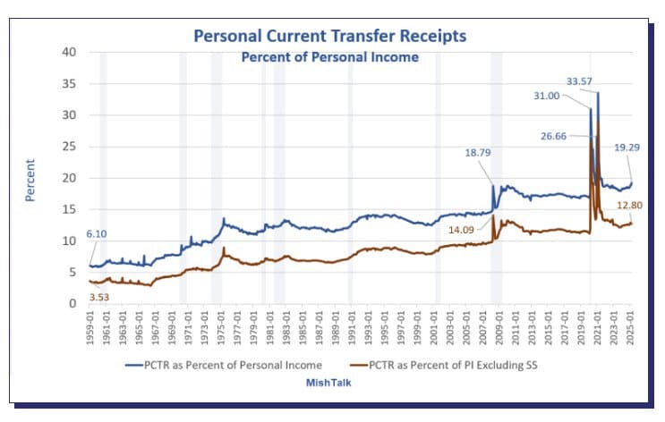 En EEUU, 1 de cada 5 dólares del ingreso personal (19,3 %) proviene ya de transferencias del Estado, públicas como Medicare, Medicaid y Seguridad Social —el nivel más alto fuera de crisis como la del 2008 o la pandemia.