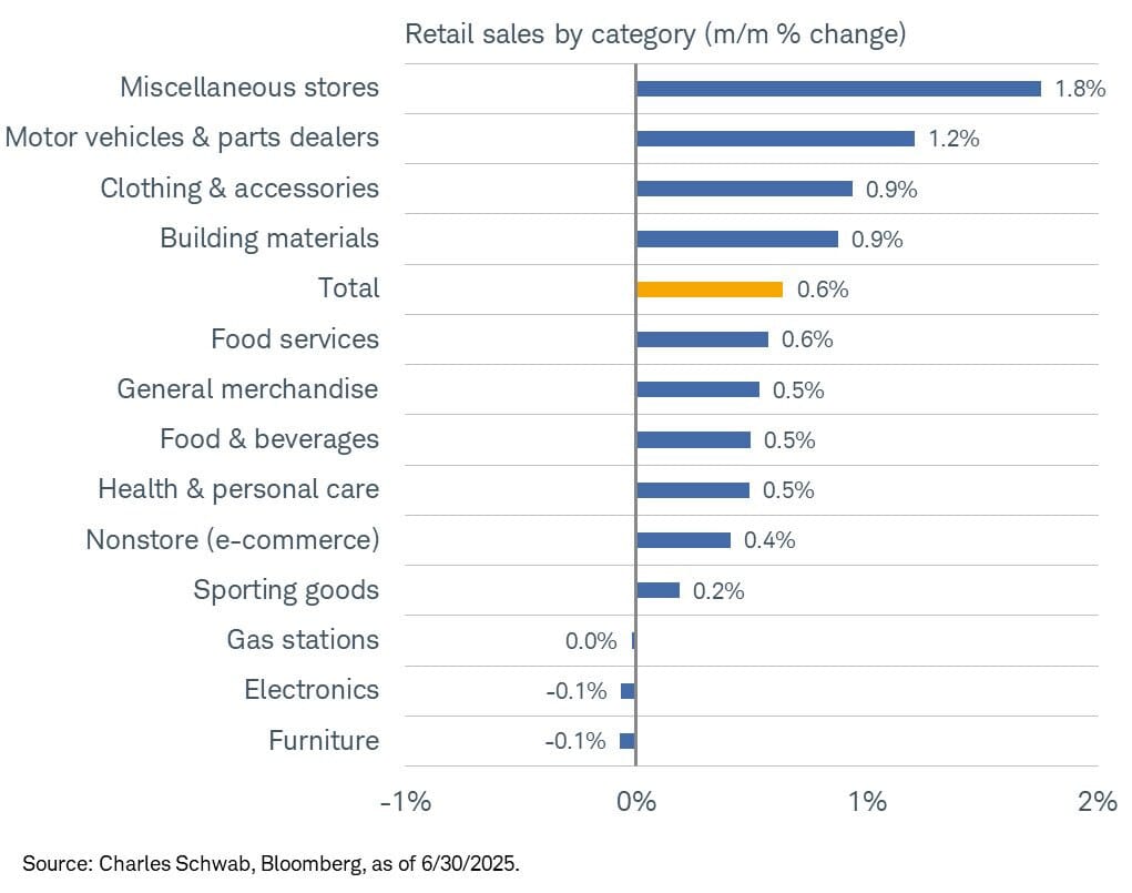 Las ventas minoristas en Estados Unidos aumentaron un 0,6 % mensual en junio de 2025, tras dos meses consecutivos de caídas, y superaron las expectativas del mercado, que anticipaban un aumento del 0,1 %.