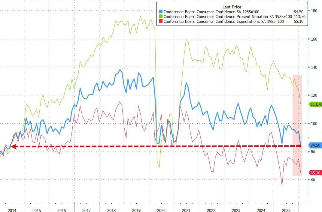 Pero la realidad fue mucho peor: el dato general se desplomó de 94,2 (revisado al alza desde 89,1) a 84,5 (muy por debajo del 91,0 esperado), el nivel más bajo desde mayo de 2014.