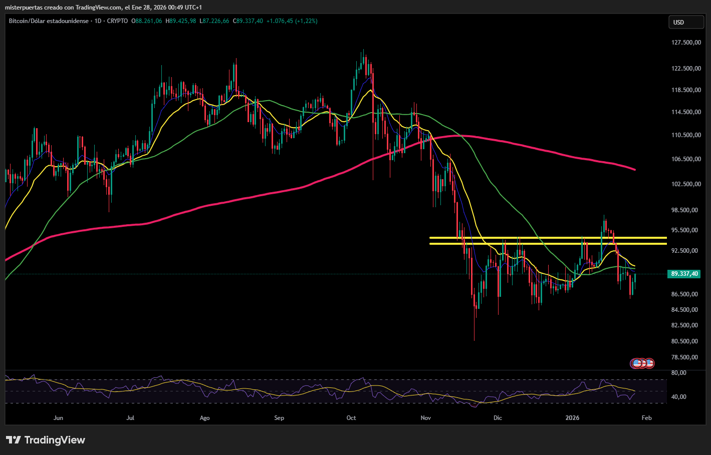 Bitcoin, de momento, se mantiene por debajo de los 90.000 dólares pese a la caída del USD.