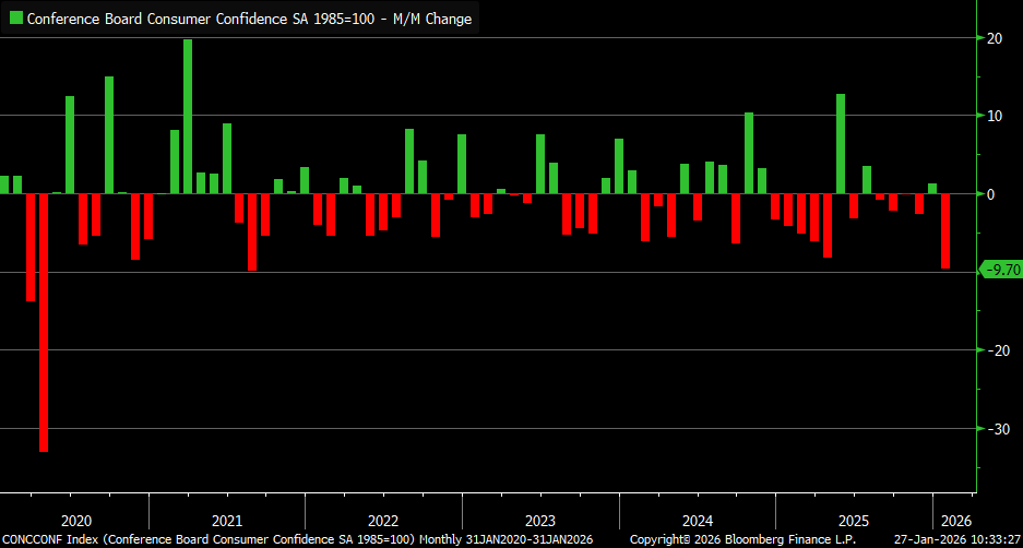 Si se excluyen, el resto de la economía fue netamente negativo.El índice de confianza del consumidor del Conference Board cayó a mínimos de ocho meses para cerrar 2025, se esperaba un rebote al inicio de 2026.